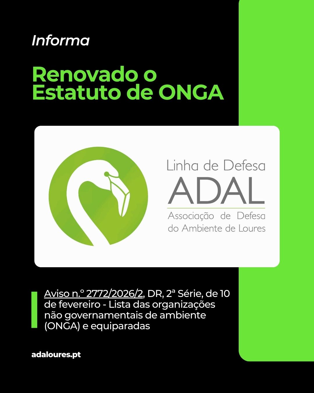 Nesta conformidade, foi publicado o Aviso n.º 2772/2026/2 com a lista das organizações não governamentais de ambiente (ONGA) e equiparadas com a inscrição ativa no Registo Nacional, até 31 de dezembro de 2025, onde consta a ADAL (Linha de Defesa – Associação de Defesa do Ambiente), enquanto associação de Âmbito Local.