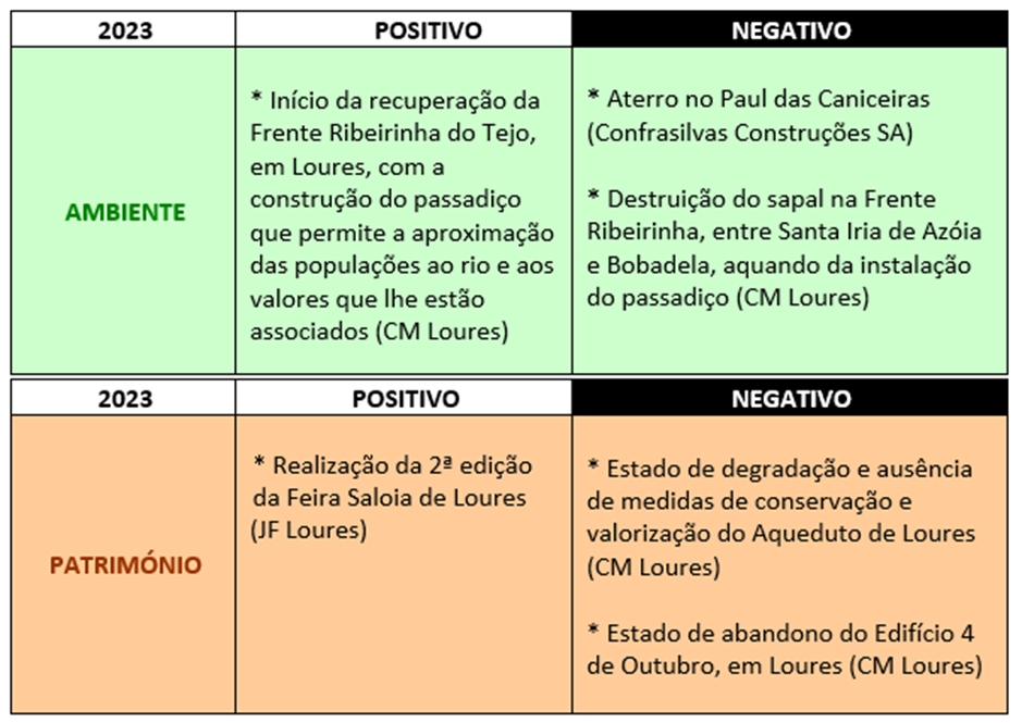Reunida em Assembleia Geral no dia 12 de Março de 2024, a ADAL apreciou as propostas apresentadas para o Positivo e Negativo do ano, nos domínios do Ambiente e do Património do Concelho de Loures, tendo elegido os seguintes: