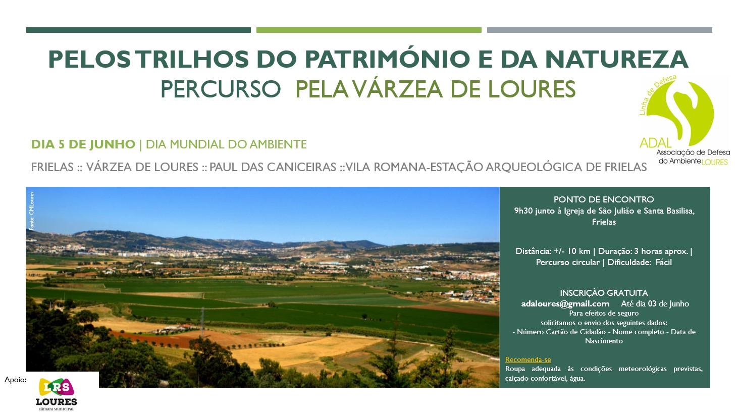 No âmbito do projecto Pelos Trilhos do Património e da Natureza, a ADAL realiza no próximo dia 5 de Junho um percurso pedonal circular, com cerca de 10 km, que parte de Frielas, percorre a Várzea de Loures até ao Paul das Caniceiras, regressando a Frielas onde terminará junto à Villa Romana.